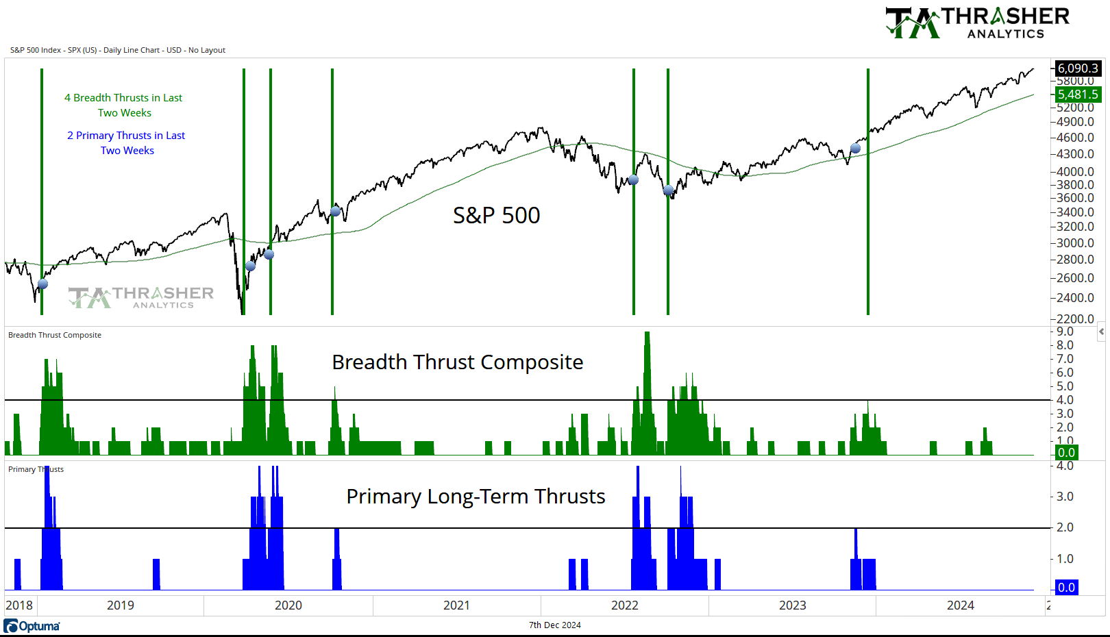 A collection of multiple breadth thrust indicators based on different indices that incorporate price and volume to mark when extremely strong buying activity is taking place by the movement of individual stocks. When multiple of these thrusts occur in a short period of time, the reaction in the S&P 500 has historically been positive going forward.