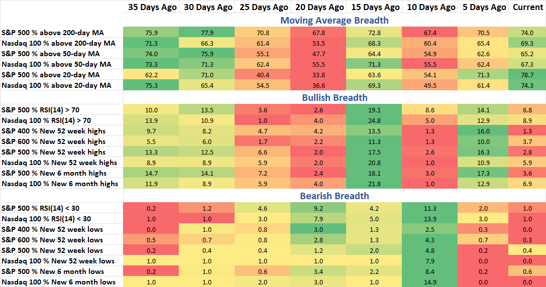 A short note this week on breadth as last week didn’t see a whole lot change across the equity market. We’ve seen the percent of stocks in the S&P 500 above the intermediate moving average go from 74% to 65%. While 65% is still a healthy number, it is off the high. The Nasdaq 100 is also showing a contraction in new highs across timeframes. This could all be easily corrected this week as traders return and trading volume picks back up. We’ll see if that takes place.