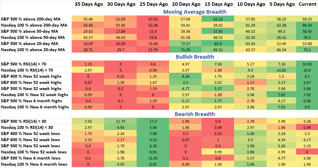A lot more green on the far-right side of the bullish breadth data section, which is encouraging. But the actual numbers are still a far cry from being robust. less than 6% of large cap, 4.55% of mid cap, and 2.6% of small caps are making new highs. While hardly any stocks are confirming what the indices are doing, they aren’t going down either. There hasn’t been expansion of bearish data yet, keeping the lid on the market truly breaking down.