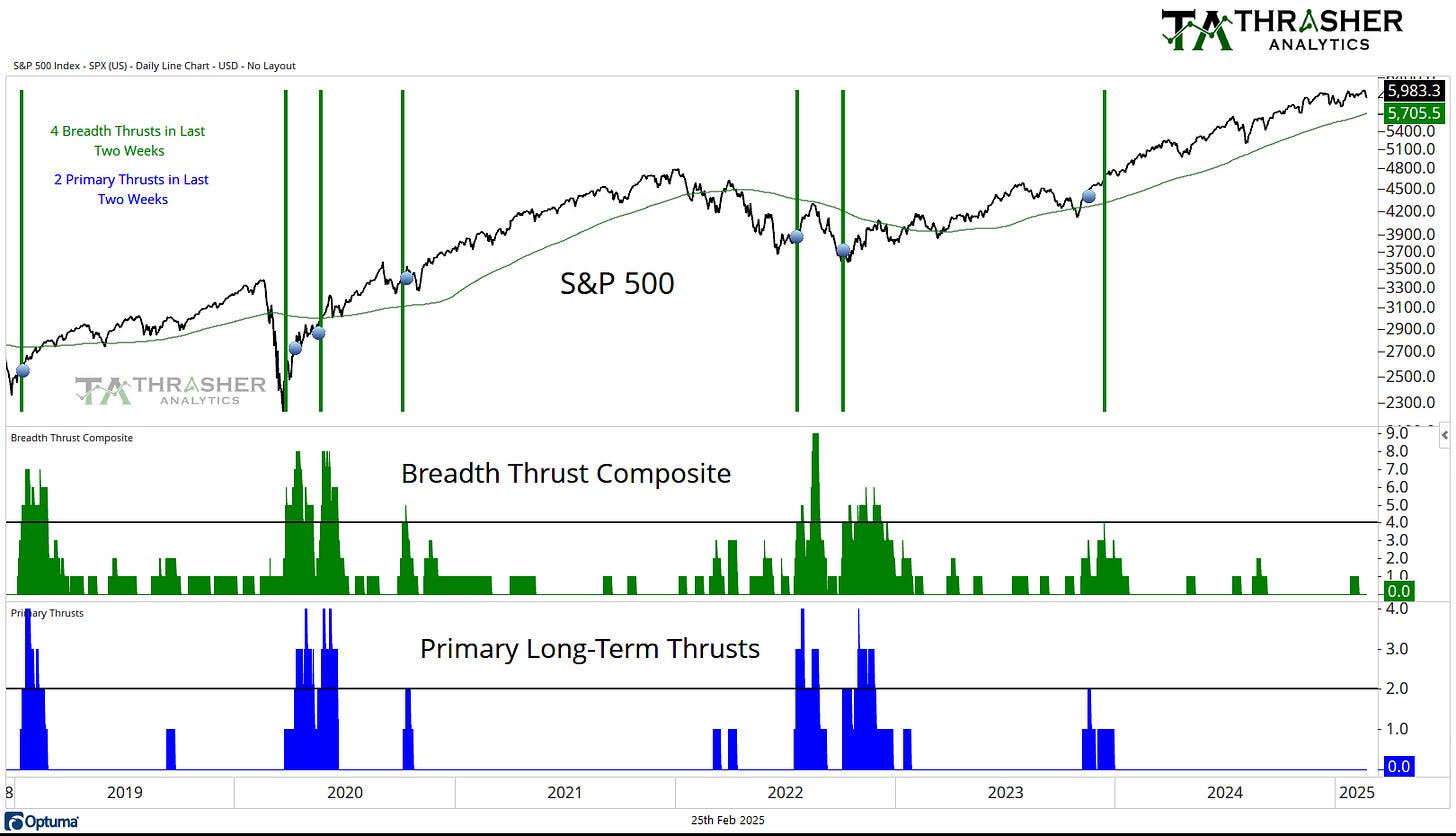 A collection of multiple breadth thrust indicators based on different indices that incorporate price and volume to mark when extremely strong buying activity is taking place by the movement of individual stocks. When multiple of these thrusts occur in a short period of time, the reaction in the S&P 500 has historically been positive going forward.