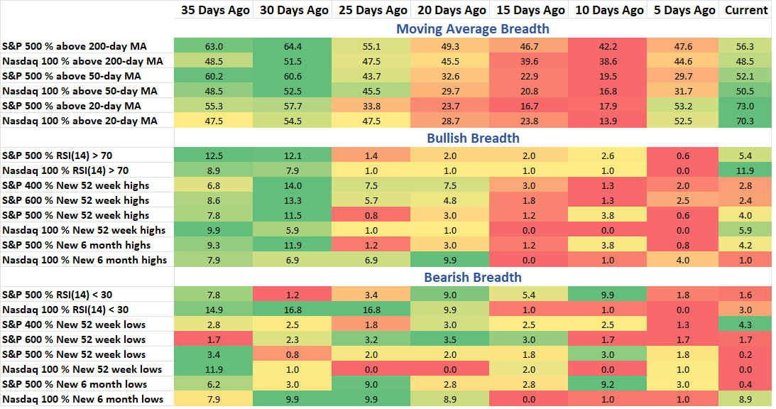 The S&P 500 hit a new all-time high today (Weds.) and coming into this day there hadn’t been a lot of stocks ‘frontrunning’ that achievement. By the close today just 45% of large cap stocks were up, again not a huge stamp of confirmation just yet. We did see the S&P 600 made a new high on Tuesday but along with mid-caps, pulled back today. This has been a very fast recovery in U.S. equities. In fact, I shared on Twitter/X that only two prior times has the 14-period RSI for the S&P 500 gone from under 30 to over 70 in just 15 days. It hasn’t happened today yet, but the momentum indicator is less than two points away. Breadth has been improving and there has been an uptick in Breadth Thrusts; we’ll see if that continues to improve and participation broadens as more stocks (hopefully) rise in performance.