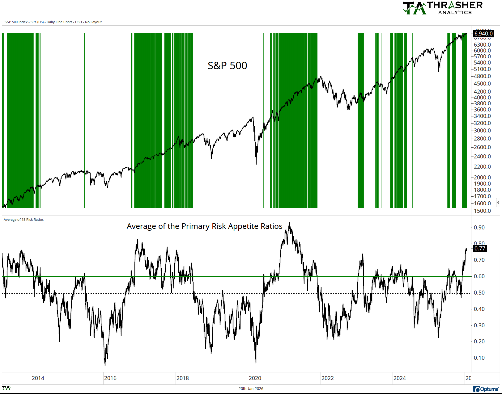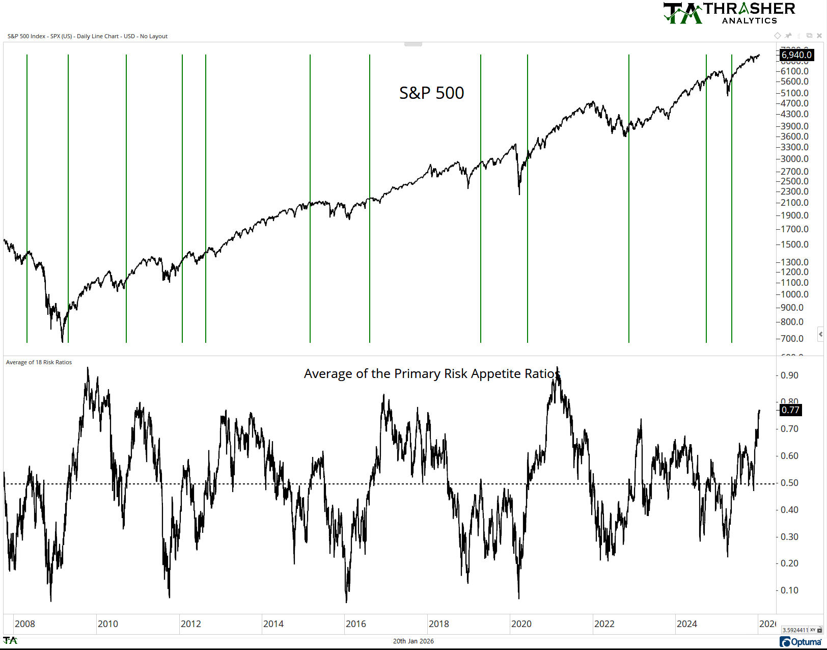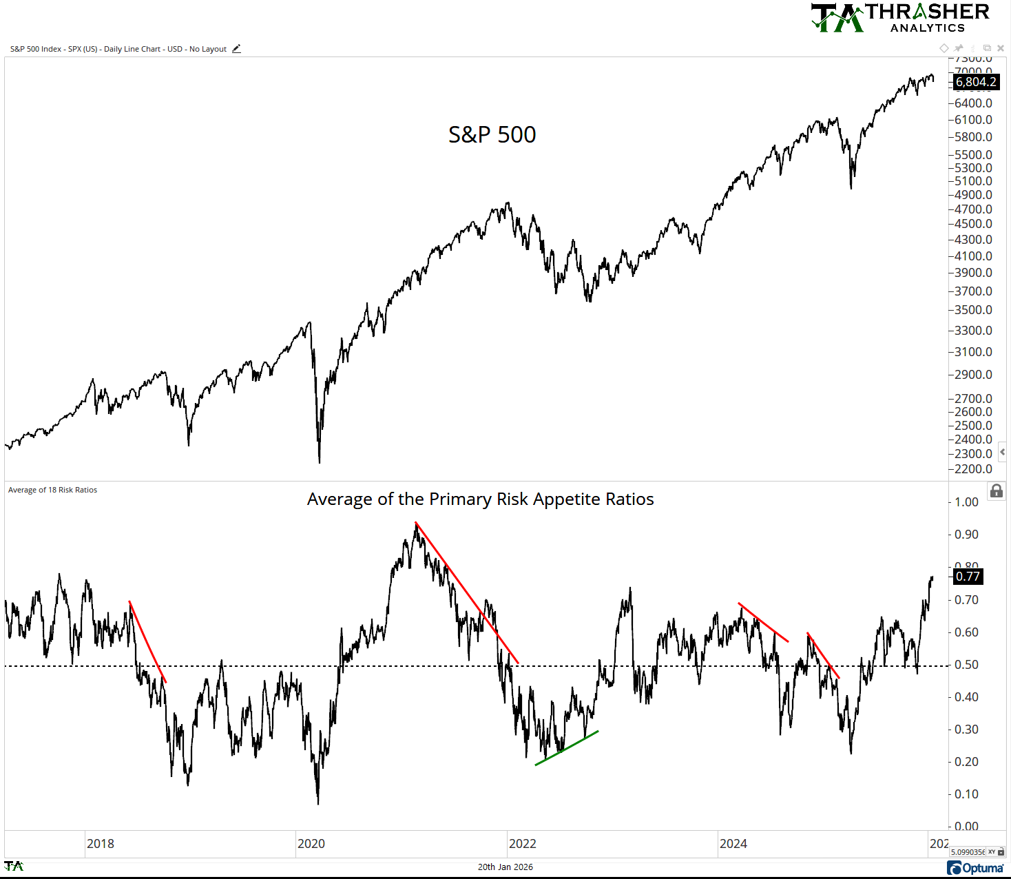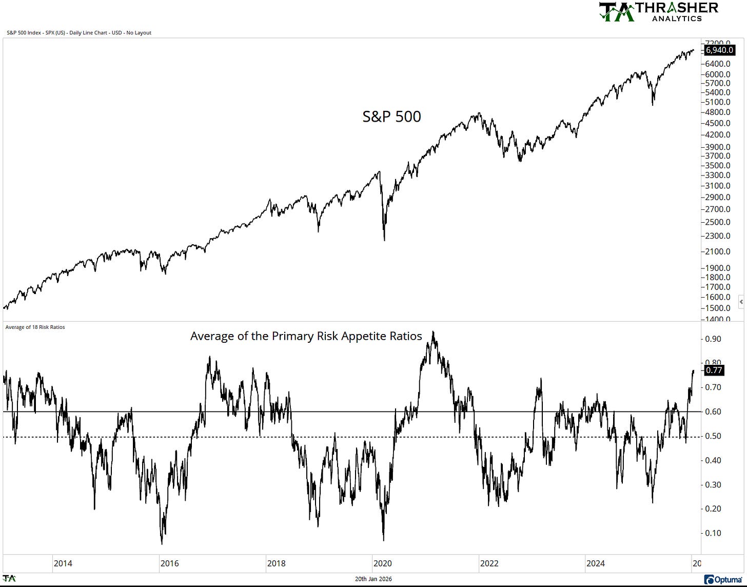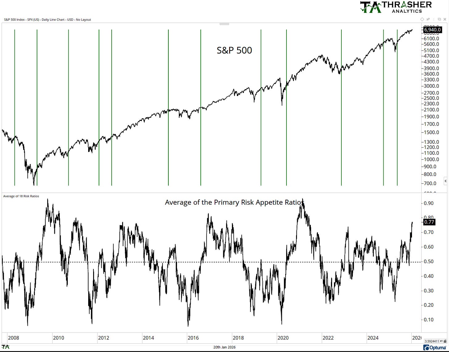 When the average of the ratios of one-year percentiles is elevated, meaning above 60 (marked by the green bars), the S&P 500 often continues to move higher. It’s when the Average of the Risk Appetite Ratios falls south of 60 or 50 do we start seeing the S&P 500 under pressure. This doesn’t mean there haven’t been small pullbacks like during the uptrend in 2023 and 2024 when Risk Appette was high. But note the Average Risk Appetite going into the highs of 2018, 2020, 2022, and 2025. All were under 60.