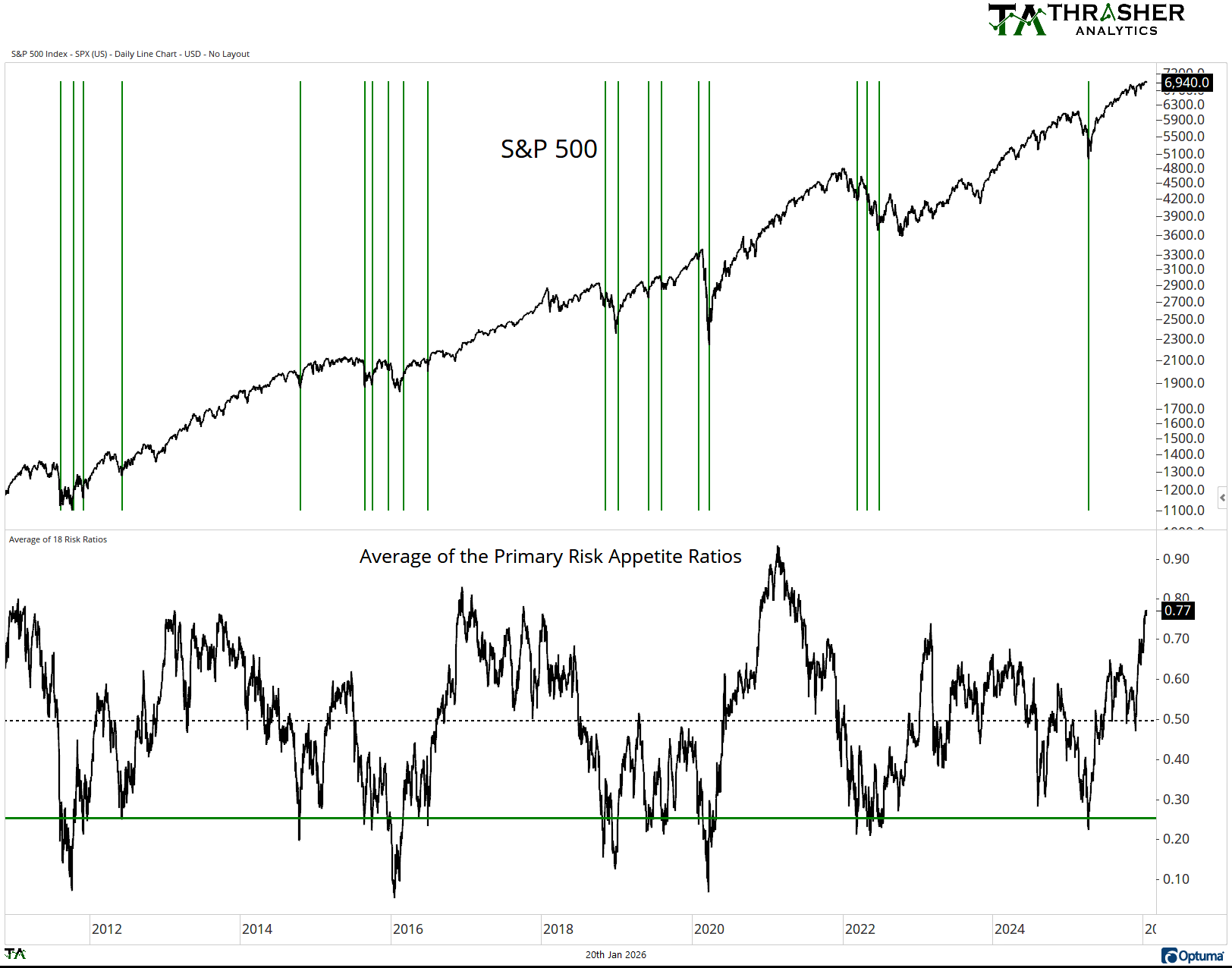 A more conservative approach to Risk Appetite is when we see it move from the bottom third (under 33) to the midpoint (50). This type of change is shown in the following chart’s green lines. Here we see it occurring after the final lows of most down trends like recently in April ‘25 and after the low in 2022. However, this method can have more lag when the Average falls into the teens like it did in 2011 and 2018. In these cases, the SPX saw quite a bit of recovery before the Average Risk Appetite Ratio got back to 50.