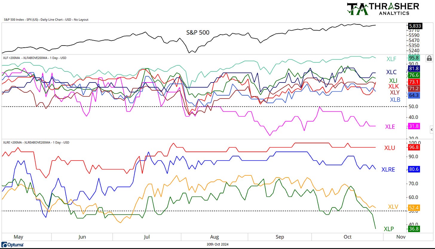 A large decline in percent of stocks above their 200-day MA within the Consumer Staples sector. Financials and Utilities remain the sectors with the most stocks in long-term up trends, at 95.8% and 96.8%. Tech has ticked higher to 73% after falling into the 60s. Notably 3 of the 4 defensive sectors have seen a decline in their breadth reading.