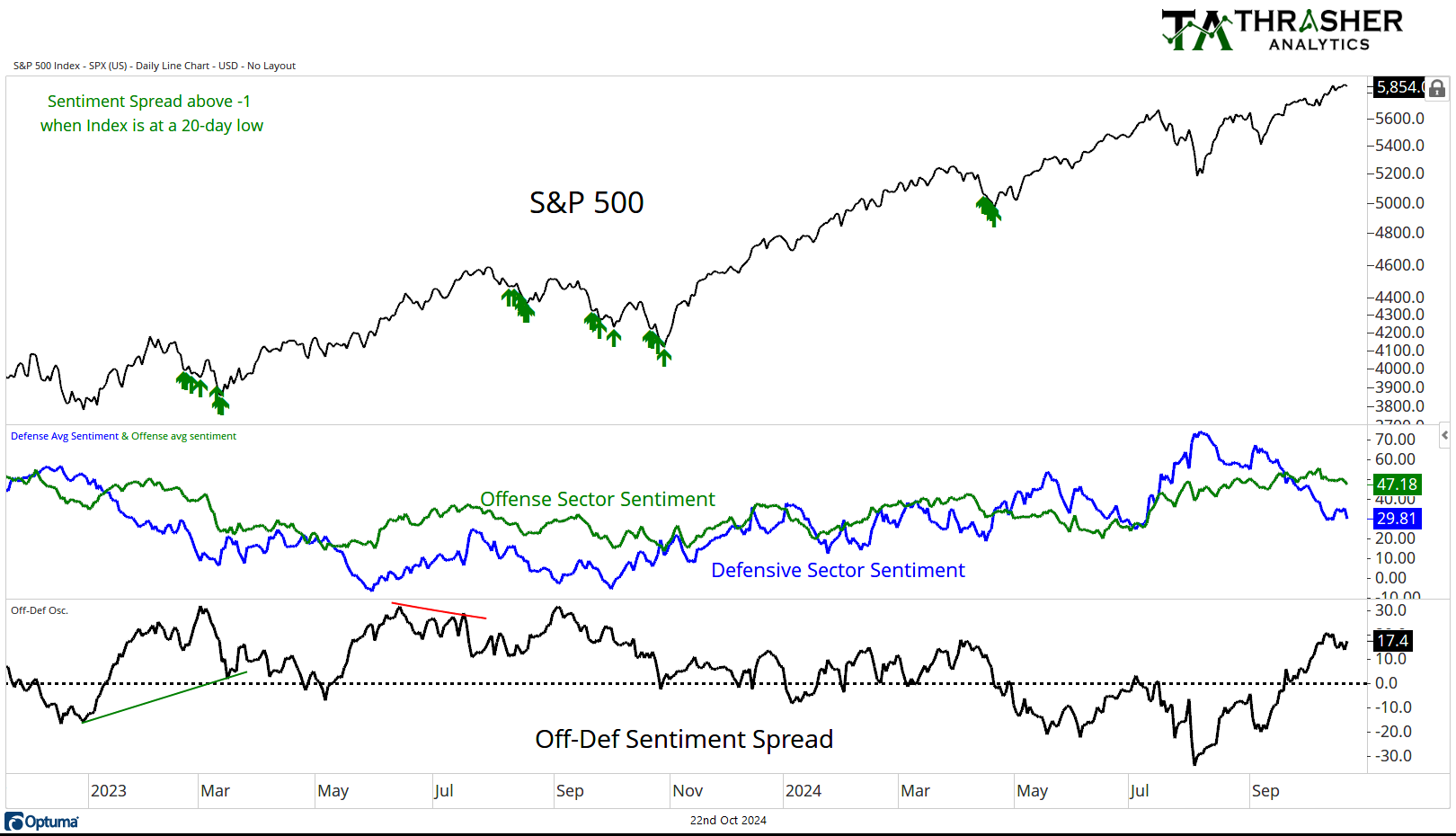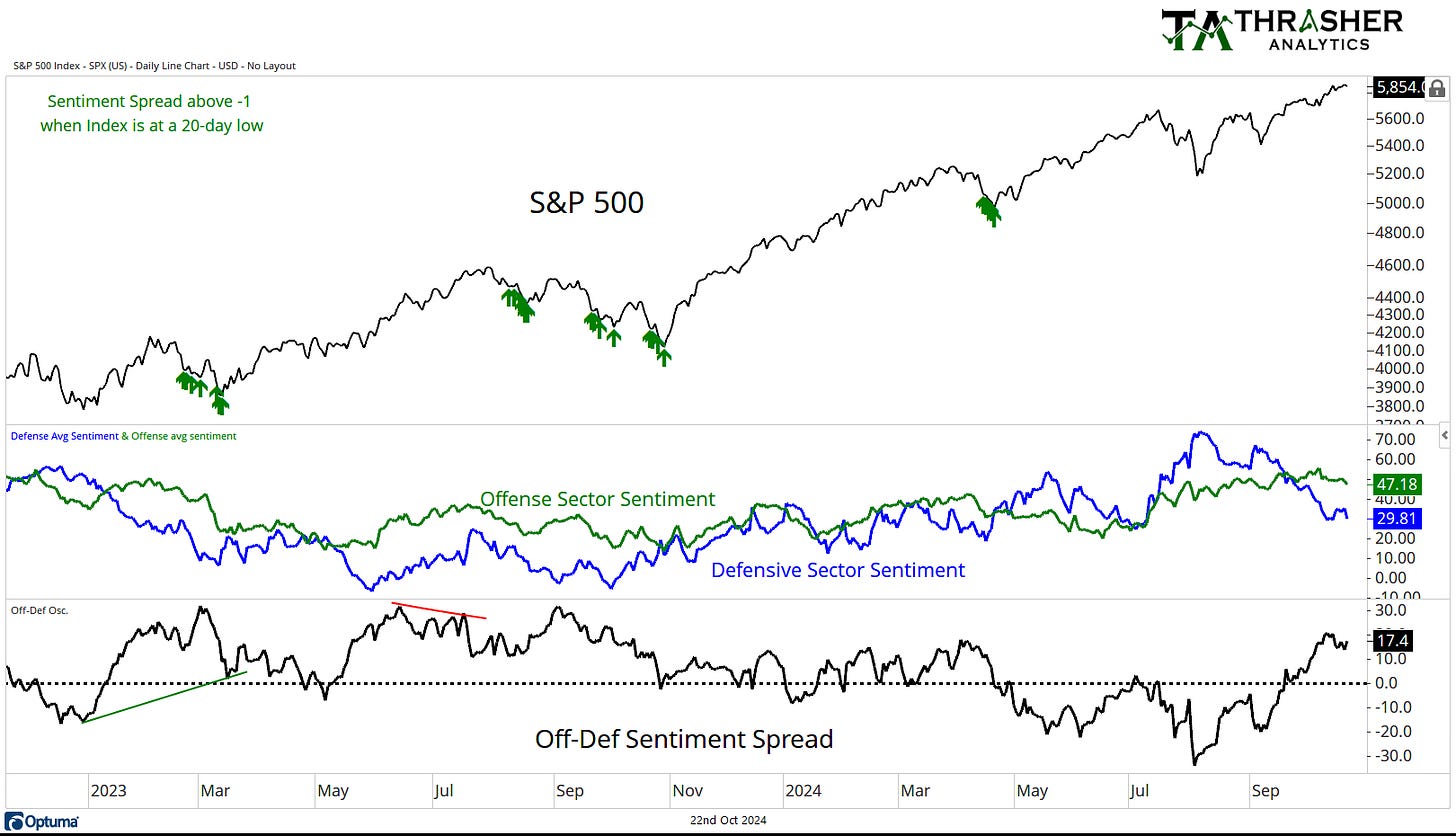 Both offense and defense sector sentiment fell over the last week, but the spread between the two remains positive. Defense sentiment has been cut by more than half since it’s summer peak and since falling under offense sentiment, the S&P 500 has remained strong in its up trend.
