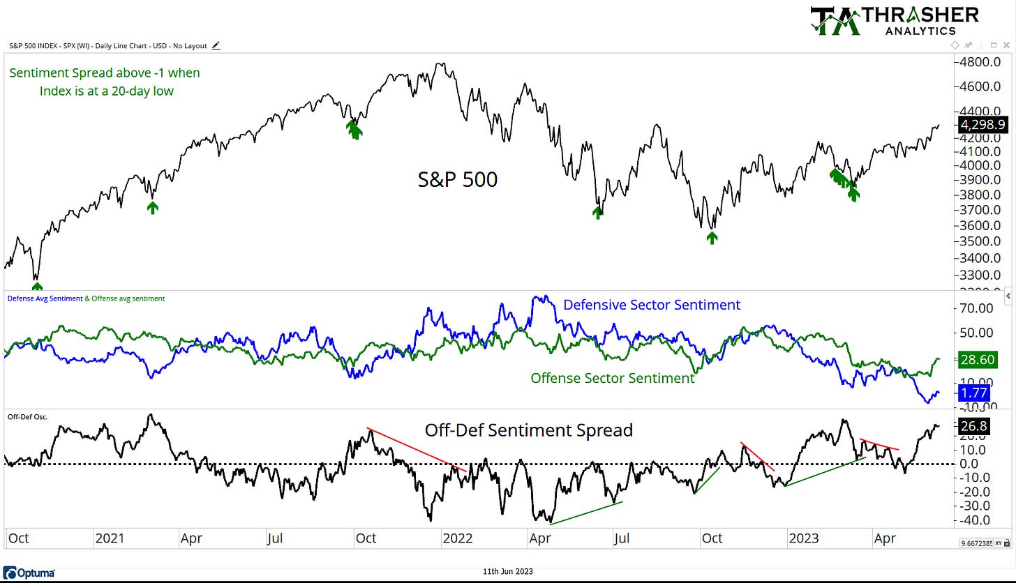 In each week’s Thrasher Analytics letter, a proprietary sentiment indicator is shown for each S&P sector as well as the average sentiment of the stocks within each sector. Plotted in the chart below are the average sector sentiment scores grouped by Defense (utilities, health care, staples, etc.) and Offense (tech, discretionary, financials, industrials, etc.).