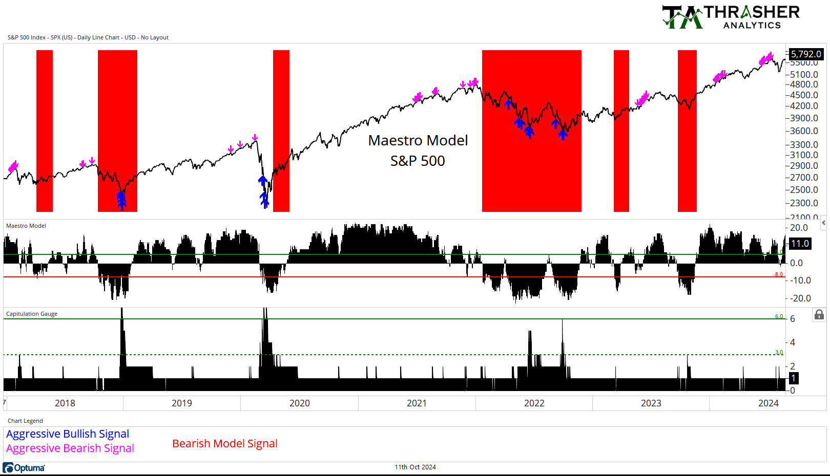 Maestro Equity Model - Incorporates three market-based categories: Breadth, Trend/Momentum, Sentiment/Volatility, & Economic (price-based data that is economically sensitive), into a single composite that provides a quantitative score for the health of the market. Paired with a Capitulation Gauge, the Maestro Model produces both Aggressive and Conservative signals for the U.S. equity market.