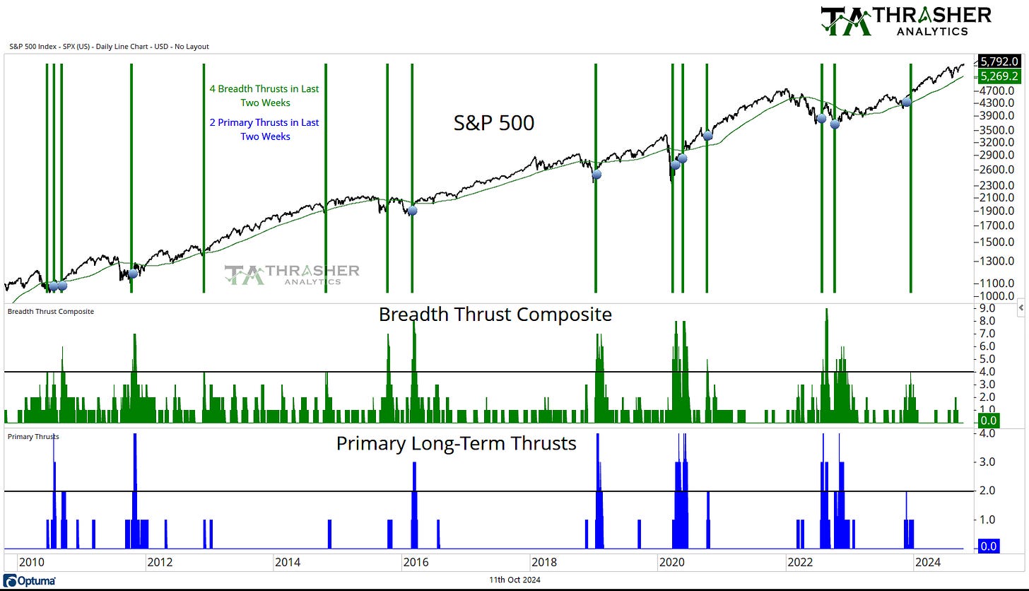 Breadth Thrust Composite - A collection of multiple breadth thrust indicators based on different indices that incorporate price and volume to mark when extremely strong buying activity is taking place by the movement of individual stocks. When multiple of these thrusts occur in a short period of time, the reaction in the S&P 500 has historically been positive going forward.