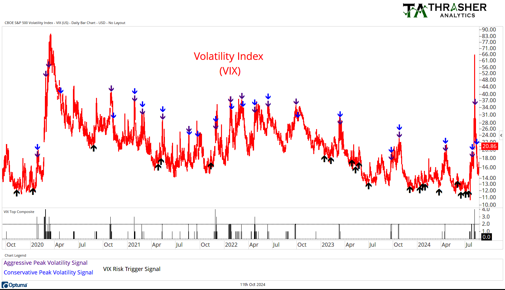VIX Top Signals - A composite of several variables that historically mark the peak in the Volatility index and signal volatility is likely to move lower.