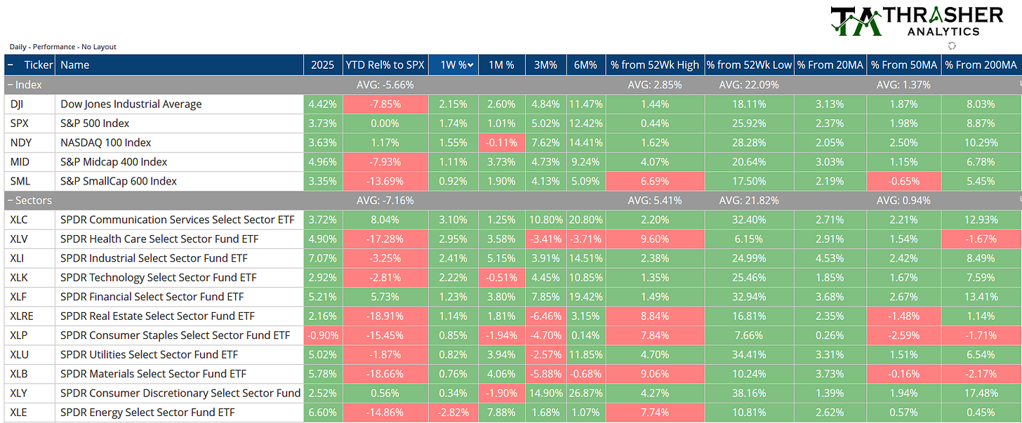 Stocked continued to advance, hitting a new all-time high with a 1.74% gain on the week, led by XLC, XLV, and XLI. God also hit a new 52-week high, something I’ve been writing about recently as the metal had been showing strength in other major currencies and now has confirmed in U.S. dollars as well. With the new high in the index, few stocks showed signs of confirming. For just the third time in 20 years less than 60% of stocks were above their 200-day moving average. The two prior instances were the 2007 peak and in 2020 before the quick -10% pullback during the recovery from the Covid Crash. While we have few stocks confirming the high, there also aren’t many making new lows either, so the market is at an inflection point, whether we see some breadth expansion or a breakdown that shows up in the new low list data.