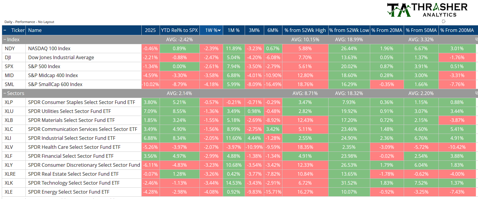 The S&P 500 finished lower last week by -2.61% with XLP, XLY, and XLB being the best performing sectors. Momentum had gotten extremely close to breaching the “overbought” level for the Index, the 14-day RSI hitting 69.96 before pulling back. SPX has held above the key 200-day MA but the Equal Weight S&P 500 failed to do so. 45.7% of stocks are still above their own long-term average.