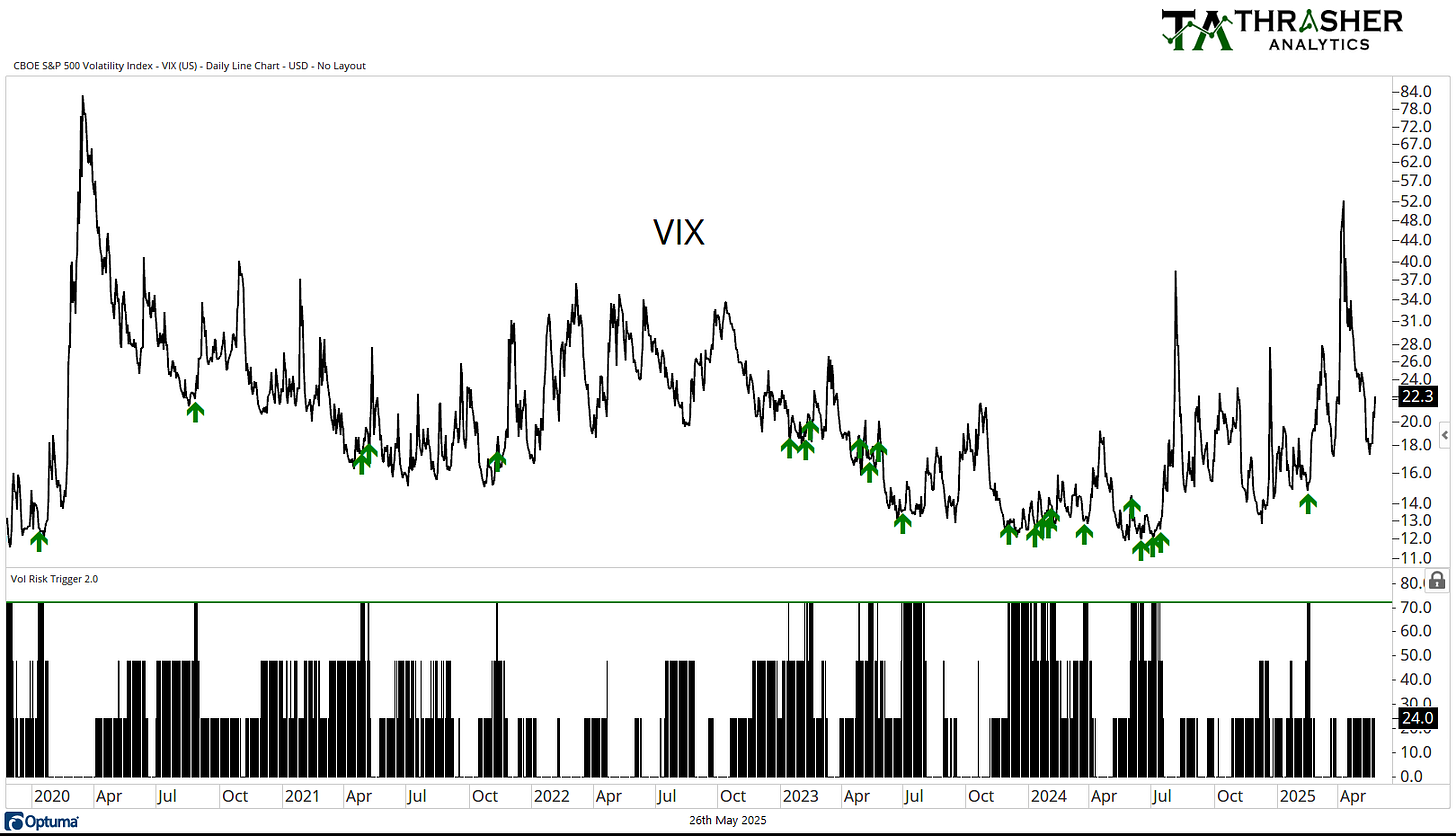 VRT remains at 24 with VIX seeing a slight uptick to 22.3 last week after been in the teens prior. VRT internals have been moving closer to a signal but aren’t at the thresholds yet.