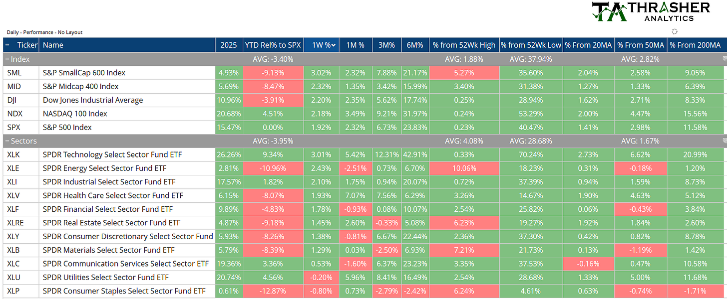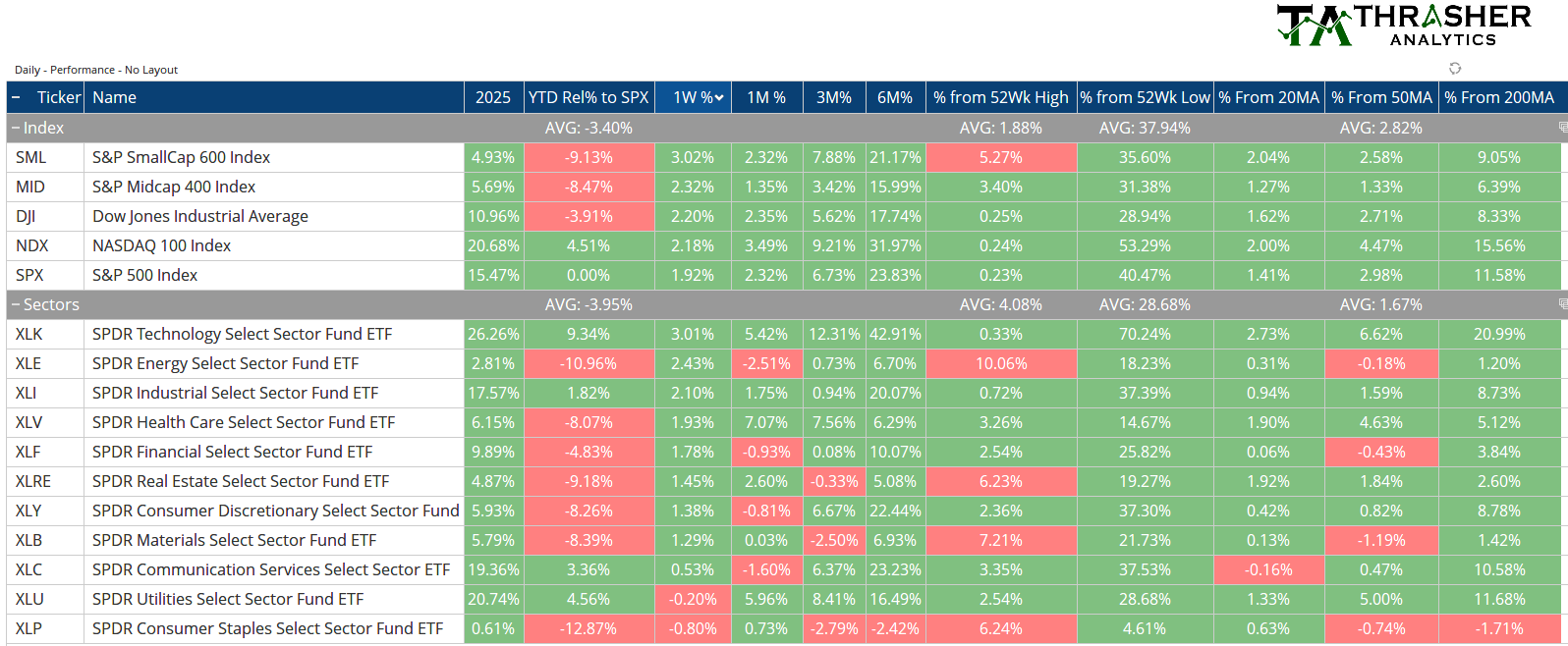 A big week for data reporting this week. Not only do we get an update from the Fed on Wednesday, with the market expecting a 25-point cut but five of the seven largest stocks in the world report earnings this week. This will be a heavy week for earning. On Tuesday we’ll get UPS, V, and PYPL. Weds. has CAT, MSFT, META, and GOOGL. Thursday we’ll get reports from AMZN, AAPL, MA, and LLY and finally on Friday earnings from XOM and CVX. Most of these mega cap names are trading near their highs, suggesting the market isn’t expecting disappointment in their reports. We’ll see if they can deliver.