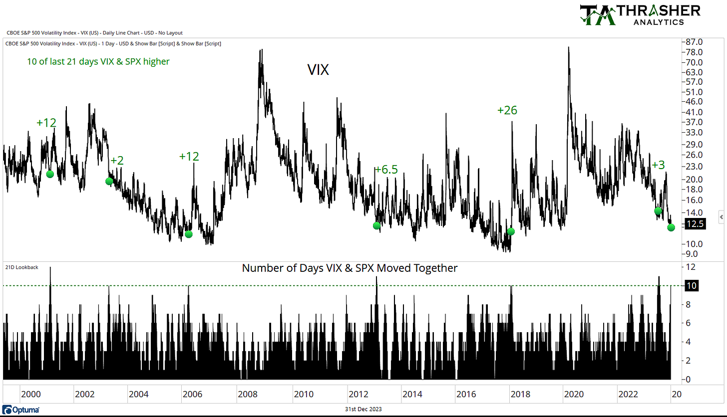 In Sunday’s letter to subscribers, I discussed the following chart which shows that the VIX and SPX has moved together in 10 of the last 21 trading days. This development has only happened six prior times since 2000, as its rare for equities and volatility to have a positive correlation for an extended period of time. Several of the prior occurrences saw a double digit rise in spot VIX.
