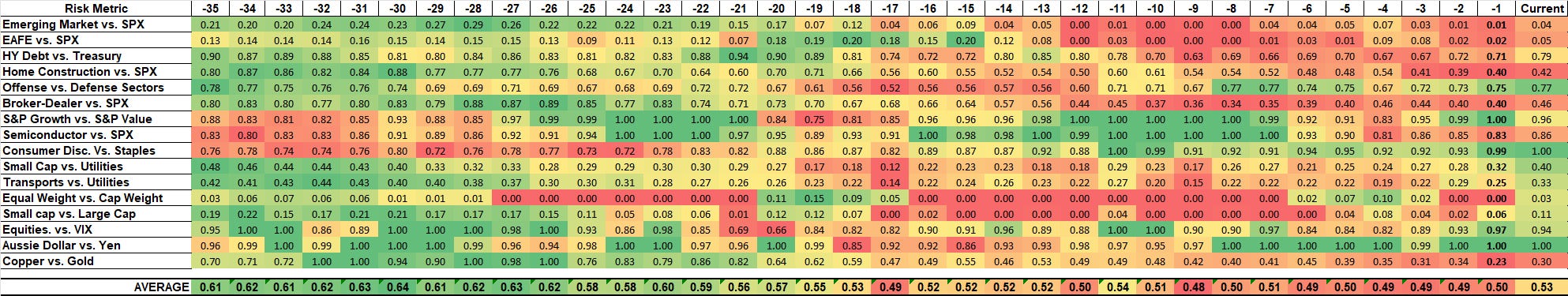 Below is a look at the ratios, showing which are rising or declining over the last 35 days. When the colors go from green to red, we know the ratio is moving lower.
